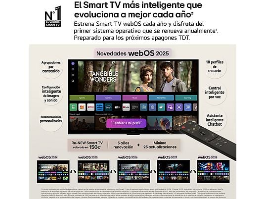 Gracias al sistema operativo webOS, este Smart TV te da acceso rápido a tus plataformas de streaming favoritas y funciones inteligentes de control por voz. Su diseño ultrafino en color Ashed Blue añade un toque de elegancia moderna a cualquier estancia. Además, con su clasificación energética D, forma parte de la gama BetterWay, más eficiente y sostenible.