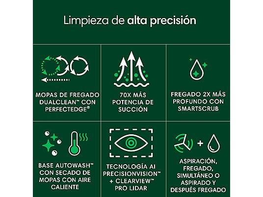 Funciones: Vaciado automático de polvo (hasta 75 días), Lavado de mopas, Secado de mopas con aire caliente, Autolimpieza de la base.